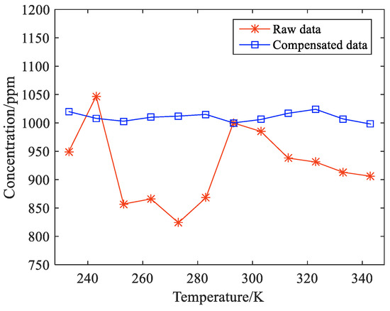 As shown in Figure 16, compared with the original data obtained from the temperature rise test of methane gas and detector at 233 K to 343 K, the compensation effect of the algorithm is obvious. The measurement value of methane is obviously disturbed by temperature before correction, and the anti-interference ability of the system is poor. After the correction, the measured value of methane is stable at about 1000 ppm, and the fluctuation is less than 3%, which improves the stability of the system. It is proven that the experimental scheme can eliminate the influence of temperature fluctuation and realize the detection of trace methane gas concentrations in a wide temperature range.