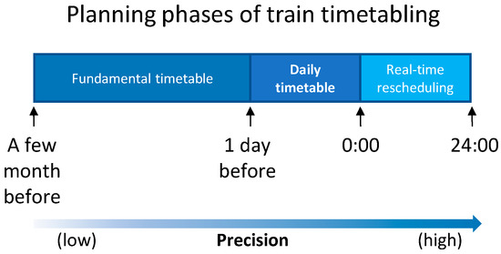 1]. When the timetable is being implemented, train dispatchers monitor the train traffic and make necessary real-time rescheduling decisions to recover the train trajectory (time-space path) of the daily timetable under disturbances. The planning phases of the train timetable are shown in