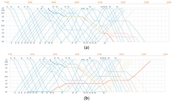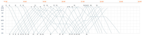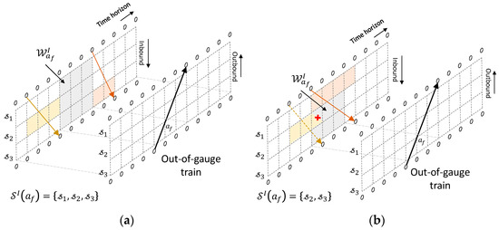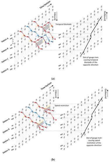 For the reasons above, when a freight train path in the fundamental timetable is decided to run an out-of-gauge train, this train path and the corresponding influenced train paths should be rescheduled. In particular, due to the speed reduction of the out-of-gauge train, trains running in the identical direction might suffer from delay propagation, while trains running in the opposite direction might also be influenced by the out-of-gauge train, due to the pass-by restriction. The impact of the scheduled out-of-gauge trains on the other trains, especially the pass-by restriction to the opposite direction train, makes it a significant challenge to make a daily timetable. Therefore, a fast-rescheduling algorithm would help create a daily timetable from a fundamental timetable, reduce timetable schedulers’ labor intensity, and accelerate the daily timetable publishing procedure.