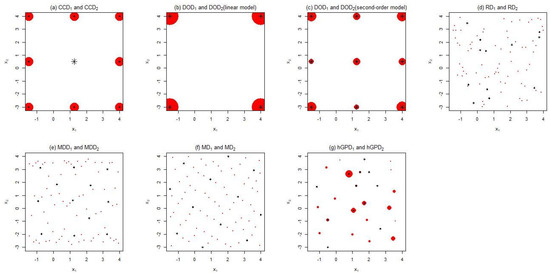 Plot of each design for McCormick function (∗ and • represent the design points in the first stage and the additional points in the second stage. The size of each label is directly proportional to the frequency of the corresponding point).