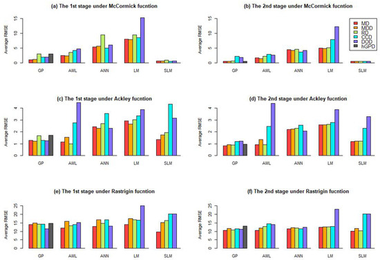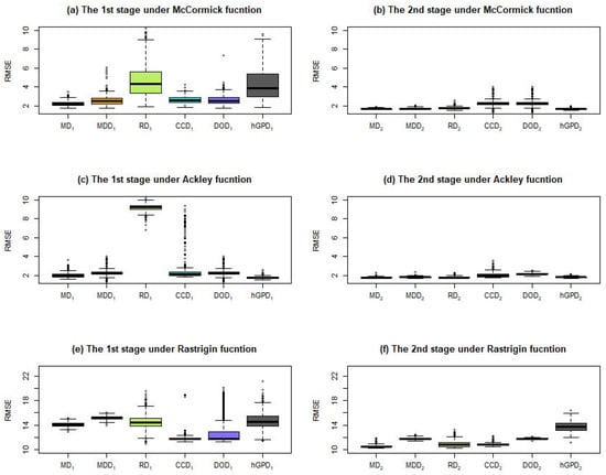 Figure 3 illustrates that the second-order model and Gaussian process model outperform other models, particularly the Gaussian process model. The second-order model performs well on the McCormick function as it can be approximated by the second-order model. However, for the other two test functions, the second-order model is not a good approximation, particularly when paired with its optimal design, as shown in Figure 3c–f. The models with maximum average RMSE under different designs are linear models. The linear model is unable to approximate the nonlinear behavior of all test functions effectively. It implies that the optimal design leads to a poorer predictive ability of the linear and second-order models under model misspecification. Therefore, we recommend using the Gaussian process model at each stage. In terms of design, the best designs with minimum average RMSE are the sequential MaxPro design, especially for Ackley and Rastrigin functions, particularly in the second stage. For McCormick functions on each stage, the best designs with minimum average RMSE are sequential maximin distance designs. The best designs with minimum average RMSE are the sequential MaxPro design, especially for Ackley and Rastrigin functions. Therefore, we recommend using space-filling sequential designs, particularly sequential MaxPro design, to estimate complex unknown relationships.