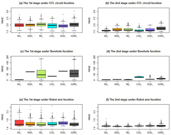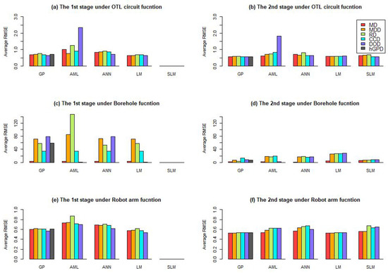 In this subsection, we consider a larger dimension. The six-dimensional cases include the OTL circuit function, the Borehole function, and the Robot arm function. Their analytic expressions and domains are listed in Table 4. Let , so that testing data have = 15,625 full grid points in the domain of each test function. Let the number of points in the first stage be 26 and that in the second stage be 104. We also conduct an example with 52 design points in the first stage. For brevity, we will not elaborate on this example any further in this paper. The average RMSE among different designs for each model in both two stages and the average RMSE among different models for each design in both two stages are plotted in Figure 5. For the second-order model, the number of all parameters is 28, so each design in the first stage is unable to estimate test function by this model. Thus, there are no data on average RMSE for the second-order model in Figure 5.