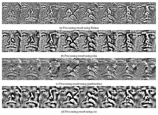 In this paper, the first eight darkest images of the first entity in Extended-YaleB use internationally recognized classical lighting processing algorithms: Retina [] (retina response algorithm), Cos [] (discrete cosine low-pass filter), GardientFace [] (gradient face), nlm [] (nonlinear local smoothing algorithm), etc. It was found that almost no algorithm could effectively deal with the problem of dark-light noise. The processing effect of each classical algorithm is shown in Figure 2. It can be seen that although the algorithm proposed in this paper introduces some noise, it can basically restore the original details of the image under extremely dark-light conditions. However, other classical algorithms can only produce an illumination invariant feature map of face images, and thus, the original information of the image is lost.
