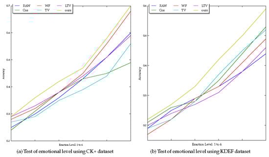 In order to verify the impact of the illumination processing algorithm in this paper on the accuracy of expression recognition under different expression levels, we use the CK+ dataset and KDEF dataset to test the impact of the illumination recognition algorithm on the accuracy of expression recognition for different expression levels, especially for slight expression levels. The experimental results are shown in Figure 3. It can be seen that the improved algorithm based on the TV (Total Variance) model in this paper has less loss of image details than other illumination processing algorithms. It has good applicability to the expression recognition problem at a slight level and has better generalization performance for expression recognition at a slight level across datasets.