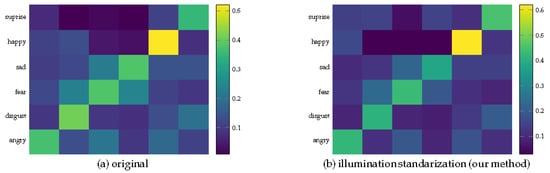 In order to observe the improvement of the illumination removal algorithm in this paper for the easily misclassified expressions, the cross-dataset verification method was used to compare the recognition effects of purely using CNN for recognition and after lighting processing on the KDEF data. As shown in Figure 4, it can be seen that although illumination processing has improved the accuracy of expression recognition to a certain extent, it has not greatly improved the recognition behavior of the CNN recognizer. That is, the facial expression categories that are more likely to be confused, such as disgust and sadness and anger and fear, are still more likely to be confused even after light processing.