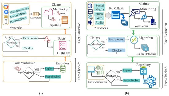 Six professional annotators spent approximately 1200 h on this investigation, annotating and fact-checking the data [21]. These annotators are highly skillful in the NLP domain. This duration includes the average search of news mutating each propaganda instance. Finally, the average length of propaganda instances is 3–80 words (slogans have shorter instances). We encouraged the annotators to select relevant sentences that do not contain enough information to decide. In their manual technique, content moderators split the procedure into fact-extraction and fact-checking, as shown in Figure 2a.