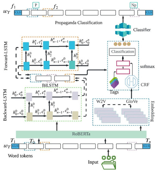 We prearranged a text illustration and identified propaganda spans in the specified sample text. The propaganda technique is also necessary because text classification relies mainly on each sample text used in the linguistic characteristics of longer texts [7,27,29]. The sentence-level propaganda method, followed by information extraction, shows how RoBERTa analysis, design, and theme characteristics are integrated. However, the pruning feature is concentrated in BiLSTM model’s last hidden layer before classification using RoBERTa to reach the SOTA results. As shown in Figure 3, the previous component gathers the likelihood propaganda label for each phrase to produce an M-count of prediction classifiers for each word token.