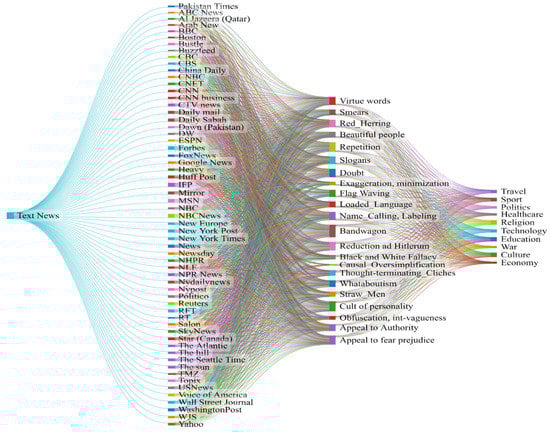 Moreover, the number of topics is altered to represent a distinct kind of news that may be visually investigated. As a result of their investigation, they discovered that earlier datasets were less likely to contain topic distributions related to sports, travel, tourism, economics, technology, and the environment. Therefore, they concluded that biased news websites are mainstream media’s primary information source, independently determining its agenda. This study investigates the claim that pro-propaganda news sources and fact-checking websites may affect how the news media covers stories and the information they verify. These websites addressed most topics/themes and news sources, as shown in Figure 4.