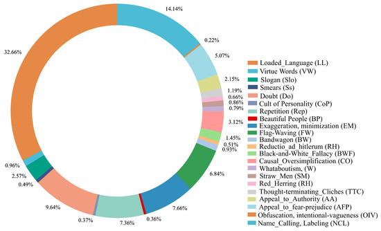Propaganda aims to influence people’s opinions and put forward a specific plan. It is difficult to determine how to monitor and where to gather propaganda data. Fact-checking starts by gathering information from dependable news sources and social media websites [33]. The information is gathered from social media and reputable internet news sources. The people’s inherent barrier to critical thinking is decreased when misinformation is presented as news since it comes from various sources. Before we built a text system that identified propaganda with linguistic indications, the news stories were individually examined and categorized according to their level of authenticity. The statistics of all instances with technique-encoded data and the 22 mentioned propaganda tactics are provided in Figure 5.