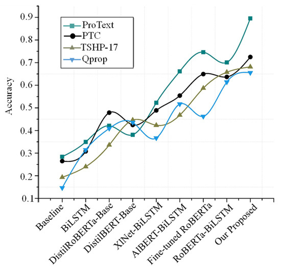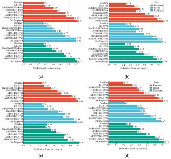 According to an ANOVA ranking of the methods based on the mean in Figure 8a, the training technique has a higher rank than the testing approach. The findings of our Kruskal–Wallis train and test are shown in Figure 8b, and they indicate that there may be a significant difference between the techniques employed to test inside vs. across at the p = 0.15 level of significance with p = 0.025. The only way to compare honestly is to create a parallel corpus with clean dataset classification results (accuracy). After training, the models are evaluated on the original subset of the 100 instance sample and the training set. Figure 9 compares the evaluation performance accuracy of Baseline, BiLSTM, Distilroberta-base, Distlibert-base, Xlnet-BiLSTM, Albert-BiLSTM, RoBERTa-BiLSTM, and our proposed models to other data.