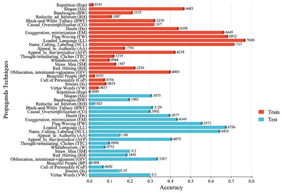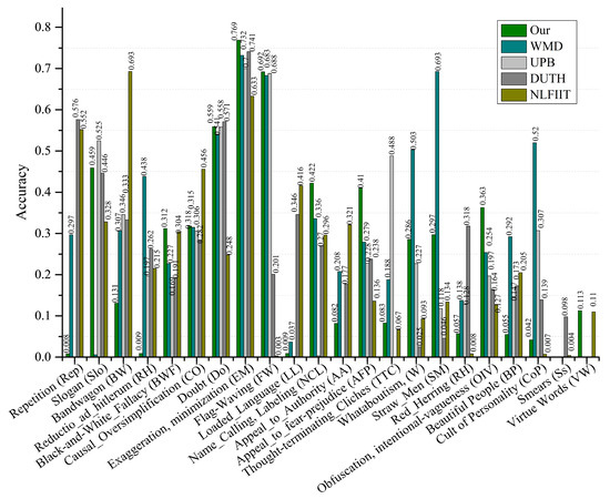 We achieved text classification in our proposed model for test score in Case1 at the first level of hierarchy with a precision, recall, and F1 of 0.7197, 0.7039, and 0.7117, respectively, and 0.7577, 0.7343, and 0.7457 in Case2, respectively. As we have stated above, the results in these datasets are more informative, but it is best to perform experiments in the two settings described above to study such effects in benchmark datasets. These results recommend that a sentence’s length and complexity effectively differentiate propagandistic sentences from non-propagandistic ones but not as effectively as LIWC, TF-IDF, and emotion do. Based on the above best parameters tuning (Case2), our classification systems finally obtained an F1-score of 0.7457, and the training procedures reserved approximately 24.3 using Nvidia GTX 1070Ti GPUs (training time depends on the number of iterations and batch size). Because the ProText in Case2 performed better in assessment, we used it for each propaganda technique, as shown in Figure 7.