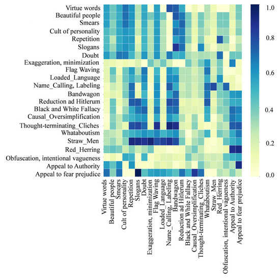 WMD [7] employed back-translation, synonym replacement, and TF-IDF replacement based on the TF-IDF score using joint BERT-based models together with SVMs, LSTM, random forest, GB, and embeddings (word/character). In DUTH [29], the convinced words were mapped into classes using NER with concentration on three entities (person, names, and gazetteers) comprising names, slogans, religions, ideologies, politics, and deviations of names of countries. The standard classifications were replaced by the category name in the input before passing the input to RoBERTa. UPB [27] used models based on BERT–they used masked language modeling to domain adapt with 9M bogus and suspicious news articles, whereas NLFIIT [28] used ELMO embeddings with BiLSTM. RoBERTa and the token segmentation with CRF were adjusted, and the outcome was that our model’s assessment performance F1 score increased—the confusion matrix of the propaganda techniques is shown in Figure 11.