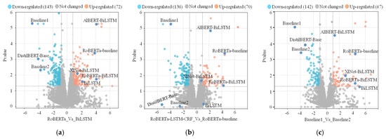 Compared to transformers, a volcano with a differentially expressed model analysis (a) RoBERTa_vs_BiLSTM, (b) RoBERTa−LSTM−CRF_vs_RoBERTa-baseline, and (c) baseline1_vs_baseline2, appears in propaganda contexts.
