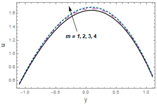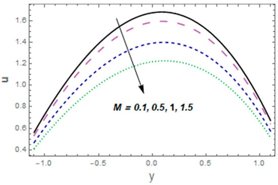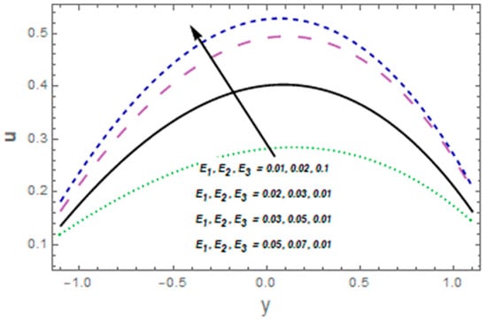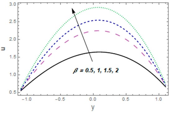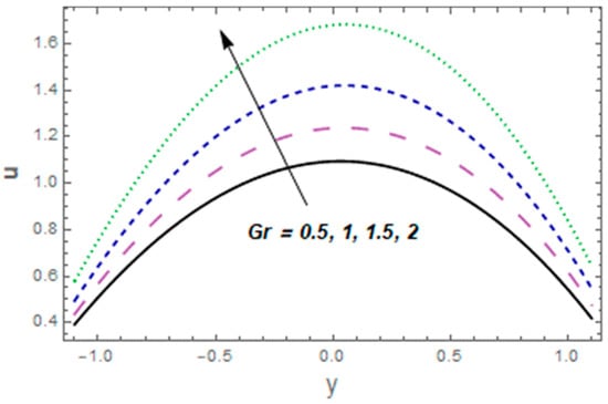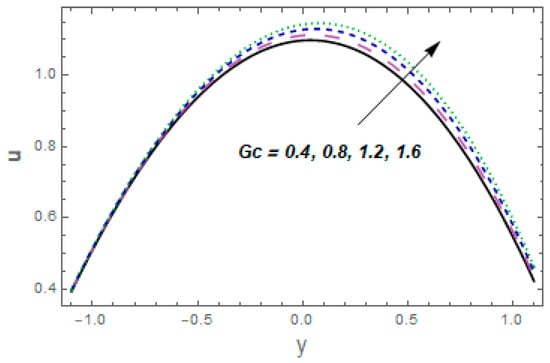Figure 2, Figure 3, Figure 4, Figure 5, Figure 6, Figure 7 and Figure 8 were plotted to see aspects of pertinent variables for the velocity profile. Figure 2 describes the temperature curves for the Casson fluid variable The velocity of the fluid was enhanced via Figure 3 designates the consequence of velocity slip parameter for velocity. Enhancing behavior was observed against velocity for velocity slip parameter This is because fluid particles which have the slip velocity in direct contact with the surface can successfully transmit some of their momentum to the fluid particles close to them. The fluid velocity increases as a result. The influence of Hall parameter is displayed in Figure 4. In this particular graph, we noted that fluid velocity was enhanced via Hall current variable The significance of the thermal Grashof number for the fluid velocity profile is shown in Figure 5. The velocity of the liquid was enhanced via a larger thermal Grashof number When the thermal Grashof parameter was high, the buoyant forces in a fluid flow dominated the viscous forces. Impressions of concentration Grashof number are exhibited in Figure 6 It indicates that higher values of the mass Grashof number give rise to an enhancement in velocity. The impacts of , and on the velocity profile are portrayed in Figure 7. The velocity of the fluid heightened for larger values of the viscous damping force and stiffness while decreasing for rigidity variables. The behavior of the velocity profile in relation to the Hartmann number M is seen in Figure 8. Near the middle of the channel, a clear decline in the velocity profile was shown along with an enhancement in Subsequently, the imposed magnetic field created a potent opposite force (the Lorentz force), and the fluid could not move. Additionally, with high Hartmann numbers, the utmost velocity shifted to the lower boundary, causing the fluid velocity to lose its symmetry close to the conduit’s midpoint.