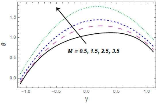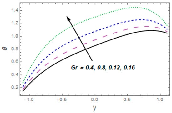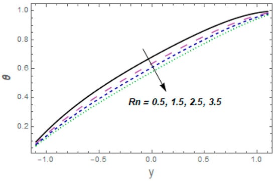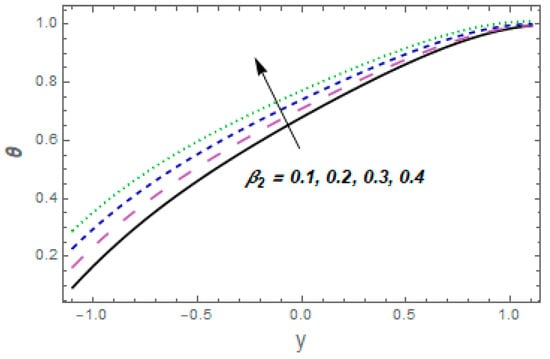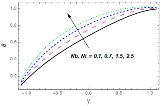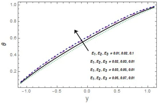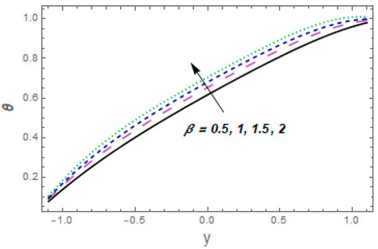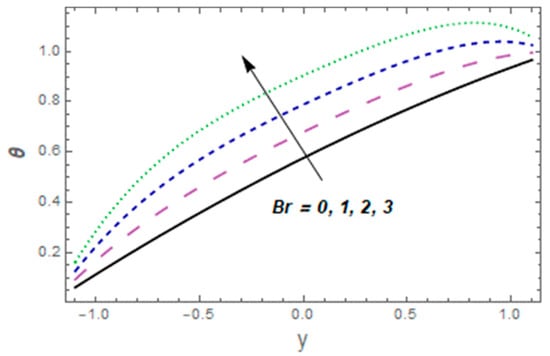 Figure 9, Figure 10, Figure 11, Figure 12, Figure 13, Figure 14, Figure 15 and Figure 16 depict how different variables affect the thermal field. The graphical representation of velocity for a few rising values of Casson liquid parameter is shown via Figure 9. The acclivitous shows a growth in the temperature. The influence of the temperature slip variable is displayed via Figure 10. As we can see in this figure, we observed an enhancement in the thermal profile of the fluid. Figure 11 depicts the consequence of the Brinkman variable for temperature. The temperature of the liquid increased with larger values of This is because caused the flow to form a resistance due to its shear, which caused increased generation of heat due to the effects of viscous dissolution. As a result, the fluid’s temperature rose. Effects of thermal Grashof number are presented via Figure 12 From this curve, we noticed that the temperature was enhanced. As the thermal Grashof parameter increased, the buoyancy forces became stronger, resulting in faster fluid motion and increased temperature. Figure 13 demonstrates the effect of Harman parameter variation on . The graph clearly indicates that a rise in Harman number produces an increase in temperature. Figure 14 illustrates the impressions of the radiation parameter on the thermal field. The variable declines with radiation parameter The combined consequences of and for the thermal field are displayed via Figure 15. We observed that the temperature of the fluid was enhanced by increasing both parameters simultaneously. When the Brownian motion rose, so did the kinetic energy of the fluid molecules. As a result, the frequency and strength of collisions between fluid molecules and suspended particles increased. This raised the temperature. The wall parameters , and are displayed in Figure 16 to show how they affect temperature. We observed that the fluid thermal profile was an ever-increasing function of and , and it decayed for