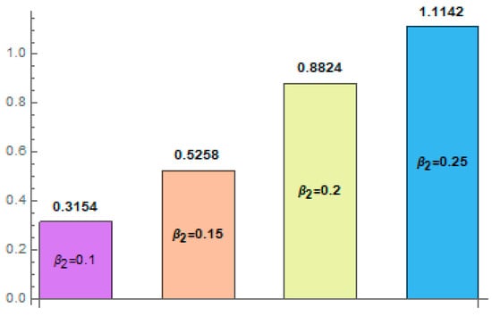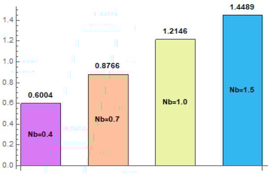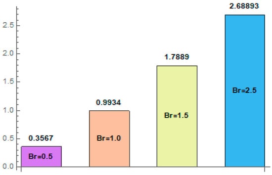 Figure 17, Figure 18, Figure 19, Figure 20, Figure 21, Figure 22 and Figure 23 are designed to see the behavior of Brownian motion variable Casson fluid variable thermal slip parameter Brinkman number radiation parameter Hall current variable , and thermal Grashof number with regards to the rate of heat transfer at upper wall When the thermal Grashof parameter is high, it indicates that the buoyancy forces dominate over the viscous forces, leading to enhanced fluid motion and heat transfer. Effects of Casson fluid variable are represented via Figure 17 An increasing trend against Casson fluid variable Impacts of thermal slip parameter are represented via Figure 18 In this figure, we noticed that the heat transfer rate increases against thermal slip parameter Figure 19 displays the features of Brinkman number on An increasing trend was noticed for via Figure 20 designates the influence of thermal Grashof number against heat transfer rate An increase in the Brinkman number implies a greater dominance of viscous dissipation over conductive heat transfer, leading to an overall higher heat transfer rate. It can be seen that larger levels of increased the rate of heat transfer of nanoliquid acclivities. The behavior of Brownian variable is exhibited in Figure 21. The finding of this graph shows that heat transfer rate was boosted. Figure 22 describes the aspects of the Hall current variable for A decreasing trend was detected for higher values of the Hall current parameter. Moreover, the consequences of radiation parameter for are shown in Figure 23 The heat transfer rate of the fluid declined via