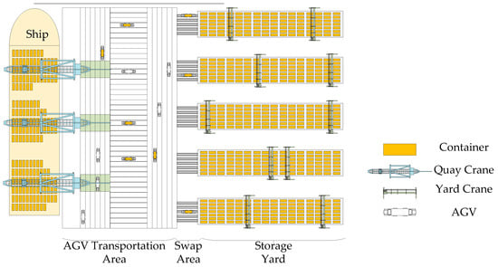 The devices of the ACT in AGV scheduling and routing involve AGVs, quay cranes (QCs), and yard cranes (YCs) (see Figure 1). AGVs are used for moving containers between QC and storage yards. QCs are to deliver containers on AGVs from a ship or containers from AGVs to a ship. The storage yard is an area for the temporary storage of containers for transferring to destinations. YCs are used to deliver containers to their storage locations in storage yards or from their storage locations in storage yards.