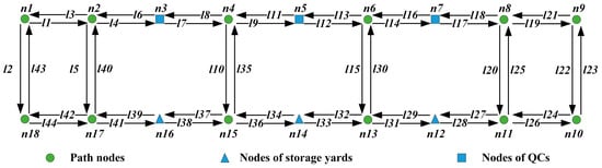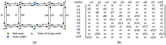 The AGV transferring area has a regular route. In order to conveniently describe the AGV scheduling and routing problem of an ACT, the transferring area is formally described as a weighted directed graph, in which there are 10 nodes (see Figure 2a). The node n3 indicates the QC, the node n8 is the storage yard, the set {n1, n2, n4, n5, n6, n7, n9, n10} is the path node set, and the set {l1, l2, …, l24} is the path set, whose lengths are d1, d2, …, d24, respectively. The direction of each arrow expresses the direction of AGV that they can travel on the path. Figure 2b shows the corresponding adjacency matrix, in which the symbol means there are no ways between two nodes.