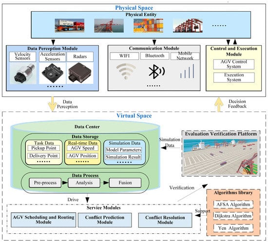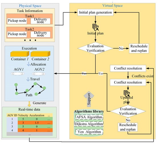 The framework of DT-based AGV scheduling and routing for an ACT consists of two parts, involving the physical space and virtual space (see Figure 3).
