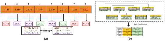 Assume 8 containers and 3 AGVs, and the encoding method is as shown in Figure 6a. Taking the first position as an example, 1.181 is rounded to 1. Therefore, container 1 is assigned to AGV 1. In the same way as for the other positions, AGV 1 is responsible for transporting containers 1, 7, and 8, AGV 2 is responsible for transporting containers 4 and 6, and AGV 3 is responsible for transporting containers 2, 3, and 5. For containers of each AGV, the order after sorting by their value is the transportation order of AGV. Taking AGV 1 as an example, the values of containers 1, 7, and 8 are 1.181, 1.211, 1.203, respectively. Since 1.181 < 1.203 < 1.211, the transportation order of AGV 1 is container 1–container 8–container 7.