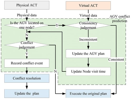 The virtual space consists of four parts, involving the service modules, algorithms library, evaluation verification platform, and data center. The functions of the data center are mainly to store data from the physical and virtual space and to process this data to provide data support for service modules. With the assistance of the algorithm library, the function of the service modules primarily consists of (1) generating an initial AGV scheduling and routing plan to guide the AGV transport process; (2) monitoring the ACT operation process and predicting AGV conflicts by comparing simulation data with real-time data; and (3) resolving conflicts caused by uncertain events, revising the initial plan, and feeding it back into the physical space. The purpose of the evaluation verification platform is to verify the feasibility and efficiency of the plan by simulation.