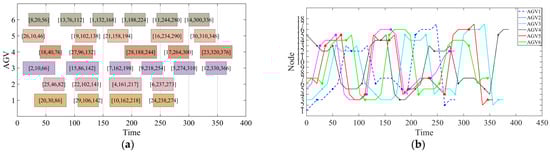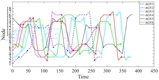 Equation (15) is related to AGV conflict. Equation (15) indicates that a safe distance should be maintained when AGVs visit the same path node.