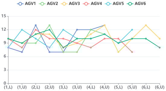 Equations (7) and (8) reflect the time correlation between the two adjacent tasks performed by the same AGV. Equation (7) indicates that the start moment of the first task for the AGV is the time from its start position to the pickup point of its first task. Equation (8) indicates that the start moment of one task for the AGV is the time from its start position to the pickup point of its first task. The start moment of the current task is equal to the sum of the start moment of the previous task, the loading time of the previous task, the transport time of the previous task, the unloading time of the previous task, and the time from the delivery point of the previous task to the pickup point of the current task.