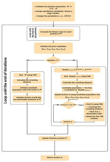 As previously mentioned, the candidate population was the basis for updating the archive. In other words, this population contributed to the diversity and convergence toward the Pareto optimal set. In a later step, the EO would use four candidates to manage the movement of the particles. However, in this study, we used the population of the candidates, as this population’s candidates were the non-dominated solutions obtained by applying the FNS and the crowding distance. The solutions of this population were guided by a set of two populations during the exploration and exploitation of the search space during the course of the iterations, resulting in a double population. We combined the previous particle population and the current archive population into one population; therefore, these two populations highly contributed to the diversity and the convergence. After combining these two populations, the FNS was considered to preserve the best solutions resulting from both populations. Then, the crowding distance was computed on the last level of the non-dominated solutions. The large distances were selected to complete the candidate population. The three key parameters used to update the candidate population were the following: