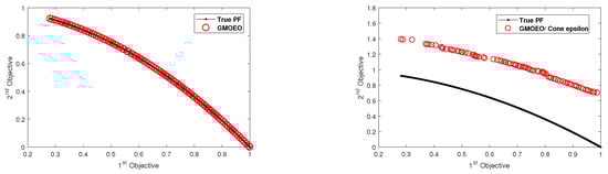 In order to ensure the performance of the proposed GMOEO, an external archive was used. This archive assisted in maintaining the non-dominated solution and cooperated in the movement of the particles toward the Pareto front. In other words, this archive acted as the equilibrium pool. Two benchmarking strategies were adapted for updating the archive’s solutions: first, we considered the -dominance as an update strategy; second, we employed the cone--dominance.