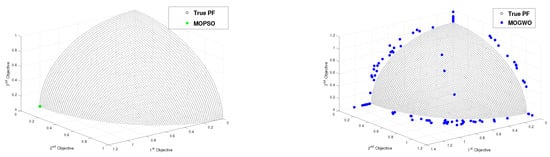 Therefore, we evaluated the of the IGD and SP metrics that were obtained after ten operations by comparing each pair of -GMOEO and cone--GMOEO, and MOPSO and MOGWO for each test function with a significance of . According to the results for the IGD metric shown in Table 8, the -GMOEO outperformed all the benchmarking algorithms in all the test functions, with both bi- and tri-objectives. As shown in Table 8, the indicated that the hypothesis was confirmed. Furthermore, the results showed that the proposed GMOEO was able to converge toward the Pareto optimal more efficiently than the other algorithms, including cone--GMOEO. According to the results of the SP metric shown in Table 9, the -GMOEO method outperformed all other algorithms in of the test functions.