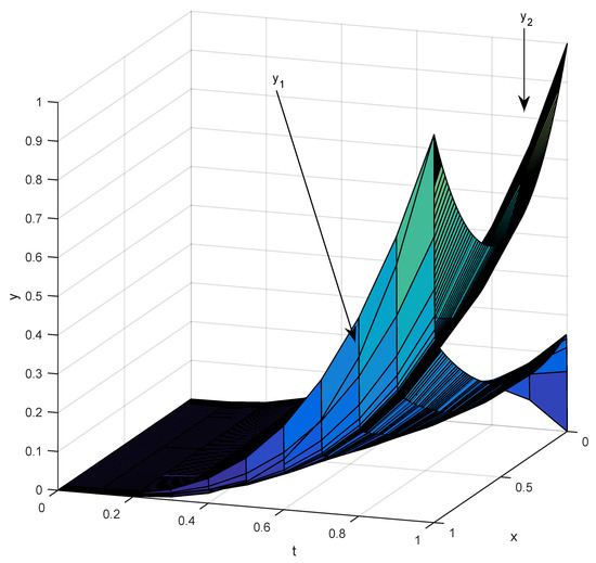 It is to be noted that the above problem satisfies conditions (3) and (4) and all the compatibility conditions (6)–(10). For different values of the values of , and in the variable x with a uniform mesh consist of 10 mesh intervals for the variable t given in Table 1, and for different values of the values of , and in the variable t with a piecewise uniform Shishkin mesh consist of 128 mesh intervals for the variable x given in Table 2. From Table 1 and Table 2, it can be observed that the errors are independent of the singular perturbation parameter and decrease as the numbers of mesh points M and N increase. Surface plots of the maximum error of the solution of the above test problem are presented in Figure 1 and Figure 2. For , and Figure 1 shows the numerical solution of the component of the solution . It is observed that the component changes rapidly near and (boundary layers) due to the presence of the perturbation parameter. Figure 2 shows the numerical solution of the component , but it varies smoothly throughout the domain. Furthermore, Figure 3 shows the numerical solution of for the errors given in Figure 4 and Figure 5, which clearly indicate that the error bound is , as expected.