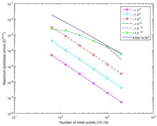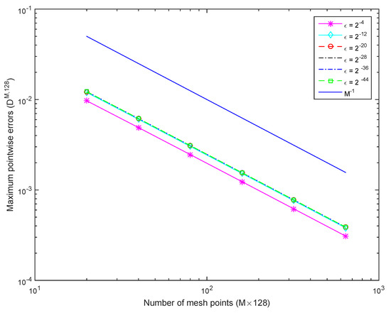 of the maximum pointwise errors corresponding to Table 1 for Example 1.