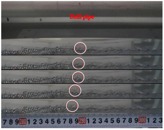 Step 3. Cuttings Bed Height Calculation: in this study, the displacement was reduced which made the particles static after sinking. Once a stable cuttings bed was formed, this study used protruding particles on the bed surface as the observation objects. Next, we took fixed-point photos and measured the bed height. Since the outer wall of the annulus is circular, the arc length was measured to obtain the corresponding cuttings bed height.