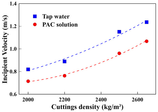 The influence of the cuttings density on the incipient velocity is illustrated in Figure 5. When the particles on the surface of the cuttings bed were mobilized, the required flow rate of the drilling fluid increased with the density of the particles. The velocity required for the mobilization of the cuttings particles in the PAC experimental fluid was lower than that in the tap water experimental fluid. Increasing the density of the cuttings had a negative impact on their mobilization, leading to an increase in the height of the cuttings bed and a decrease in the effectiveness of the cleaning in the annular space.