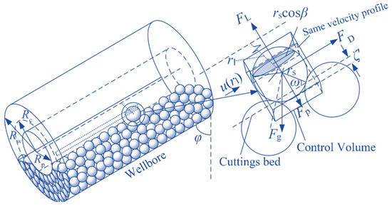 In this study, the following assumptions were made before establishing the incipient velocity model: (1) the drilling fluid is an incompressible medium; (2) spheres replace the actual irregular cutting particles with the same diameter; (3) the average bed surface replaces the actual cutting bed surface; and (4) the annulus is concentric, and the drill pipe does not rotate. Based on these assumptions, the incipient motion of the cutting particles on the bed surface was analyzed and the model was derived.