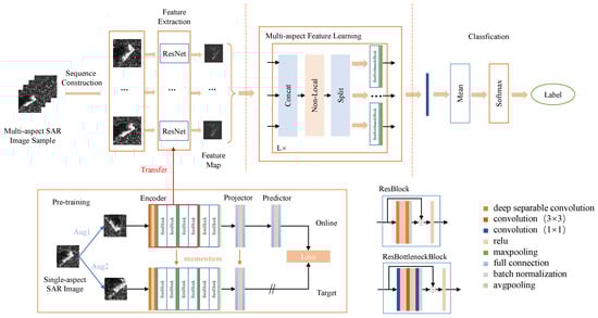 The multi-aspect SAR image sequences are constructed based on the single-aspect SAR images, which are also used for pre-training. In the CL network for pre-training, traditional data augmentation methods are used to generate two enhanced views for a single SAR image, each serving as input for the two branches. The optimization of the pre-train network is achieved by reducing the differences between the output features of two branches. After pre-training, the encoder part of the upper branch is transferred to extract the feature map of each image in the multi-aspect SAR image sequences. Then, during the multi-aspect feature learning process, the extracted feature maps of each image are input into the multi-aspect encoder based on Non-Local and ResNet to learn the correlation between multi-aspect SAR images. The output features of the multi-aspect encoder are dimensionally reduced and then averaged along the sample dimension for feature fusion. Finally, the softmax classifier is used to obtain the prediction probability. The following sections will provide details and training process of the proposed method.