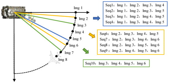 From different azimuth and depression angles, multi-aspect SAR images of the target can be obtained through one or more platforms, which can be used to construct multi-aspect SAR image sequences based on the following steps [32]. The original SAR image set consists of multiple categories . The images in each category are sorted according to the azimuth, which is denoted as . C represents the total number of target categories, represents the number of images contained in each class and is assumed to be the azimuth angle of the image. For the given sequence length k, images are selected from the original image set by a sliding window with the step size of 1, which are combined in different permutations to obtain sequences. The sequences in which the azimuth difference between any two images is less than the given angle range are selected as the experimental sample. Assume that the final constructed sequences of a certain class are denoted as , where represents the number of sequences. The construction process above is shown in Algorithm 1, and an example of multi-aspect SAR image sequence construction is shown in Figure 2.
