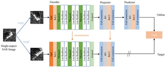To introduce contrastive learning into SAR image feature extraction, considering that the visual features presented in SAR images are often quite similar, we choose the Bootstrap Your Own Latent (BYOL) [33] network, which is based on the asymmetry of two branches instead of negative samples, for pre-training the ResNet model used for single-aspect SAR image feature extraction.