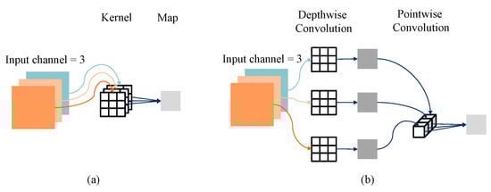 The encoder based on ResNet is used to output the feature representation of the input image. To obtain a lightweight model, Deep Separable Convolution (DSC) [34] is designed to replace the original convolution layer in ResNet, which consists of deep convolution and pointwise convolution, as shown in Figure 4. Deep convolution applies a separate convolution kernel to each channel of the input, while pointwise convolution uses the convolution to fuse the output of deep convolution across channels and change the channel number of the final output. Compared to original convolution, DSC achieves a significant reduction in parameter and computational costs.