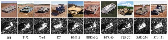 The MSTAR dataset [37] mainly comprises high-quality SAR images captured using the X-band high-resolution Spotlight SAR from 10 stationary military vehicles with the resolution of and HH polarization. The azimuth angle of images for each type of target covers 0∼, and the interval between images is 5∼. The optical and corresponding SAR images of ten targets are shown in Figure 7.