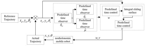 As shown in Figure 2, the detail tracking control can be described in the next three subsections. To solve the problem of unknown slipping and skidding, Section 3.1 proposes predefined time observers to achieve accurate disturbance estimation for , , and . Then, Section 3.2 proposes predefined time active controllers to achieve the high-precision tracking performance of the NMR. To solve the holonomic tracking problem of the NMR, the tracking trajectory is redesigned in Section 3.3 to realize the accurate holonomic tracking of the NMR.