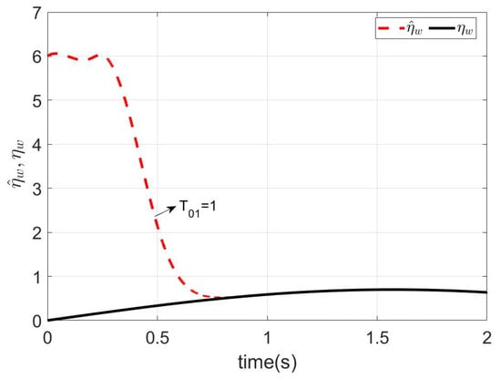 According to Lemma 3, we can design the predefined time observer for as (10). The parameters of the observer were chosen as , , , , and . Similarly, we can design the observer for as in (16), and we can design the observer as in (20), where the parameters were chosen as and . The disturbances were set as , , and . The simulation results are given in Figure 3, Figure 4, Figure 5 and Figure 6. In Figure 3, under the conditions that the initial conditions were unknown, the disturbance estimation could achieve an accurate estimation of the disturbance before the different predefined time . Similarly, it can be seen from Figure 4 and Figure 5 that, even if the disturbance was not constant, the disturbance and could also be accurately estimated within the predefined time . It was proven that Lemmas 4 and 5 are effective.