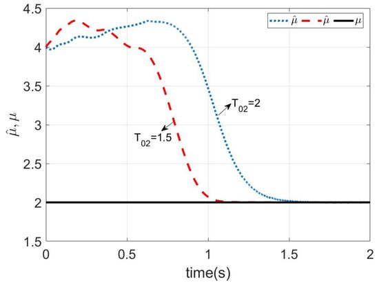 From Lemma 3, the disturbance can be accurately estimated by within the predefined time . From the observation formula of disturbance and the observation formula of disturbance μ, they both depend on disturbance , and they are independent of each other, which can be estimated simultaneously. From Lemma 4 and 5, both disturbances and μ can be accurately estimated within the predefined time of .