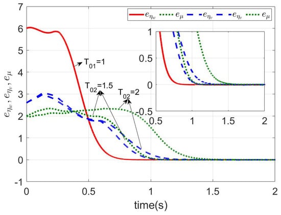 Figure 6 shows the observer tracking error curves, namely, , , and . The disturbance of , , and all converged before the different predefined time. Next, the predefined time active controller was designed for the NMR. The parameters of the controllers (23) and (33) were chosen as , , and . Then, we could get the whole predefined time, which is shown as