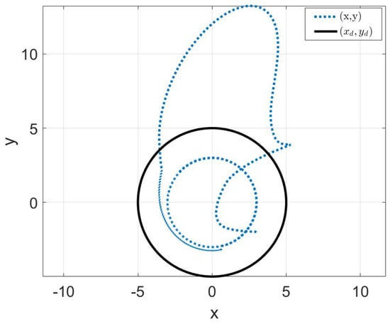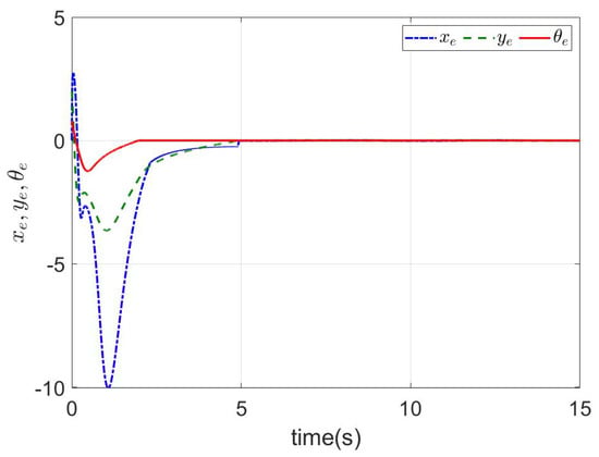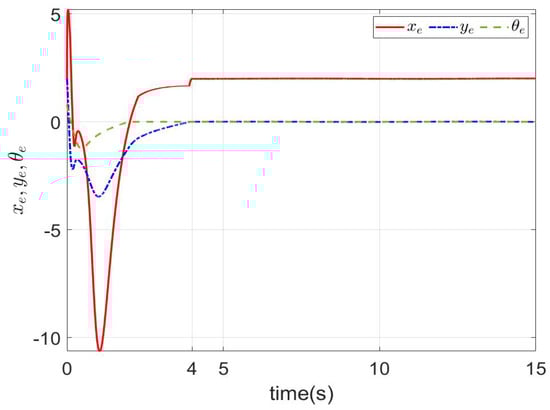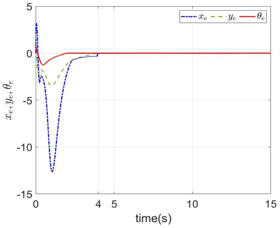 The simulation results are shown in Figure 7 and Figure 8. As shown in Figure 7, it is worth noting that the angle error of tracking posture (37) converged to zero in . Similarly, the y-axis error of tracking posture (36) converged to zero. However, the x-axis error did not to converge to zero. The reason is that the mobile robot is nonholonomic. It is consistent with the results described in Remark 1. For the actual tracking trajectory shown in Figure 8, the NMR could not fully track the given tracking trajectory. For the predefined time , the simulation results are shown in Figure 9. It can be seen that the results are the same as in Figure 7, except that the convergence time was changed. The method proposed in this article could simply achieve a change in the system convergence time by changing the predefined time parameter . In order to realize holonomic tracking, we design the tracking trajectory as