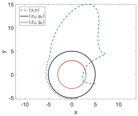 By relying on the estimation of the disturbances by observer (10), by observer (16), and by observer (20), the unknown slipping and skidding problem of system (9) was resolved. Then, the tracking problem of the system (6) needed to be solved, where the objective is for the NMR to track the tracking trajectory . Considering an NMR (6) with unknown slipping and skidding, the robust controller is designed as