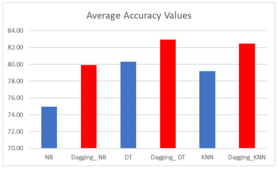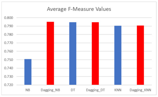 Similarly, Dagging_NB had an average AUC value of 0.785, which is superior to baseline NB (0.727) by +7.98%. Moreover, Dagging_DT recorded an average AUC value of 0.78, which is +26% better than baseline DT (0.619). Dagging_KNN (0.777) had a superior average accuracy value over baseline kNN (0.622) by +24.9%. Correspondingly, Dagging_NB had an average F-measure value of 0.805, which is superior to baseline NB (0.751) by +7.19%. Furthermore, Dagging_DT recorded an average AUC value of 0.808, which is +1.64% better than baseline DT (0.795). Dagging_KNN (0.790) had a superior average accuracy value over baseline kNN (0.807) by +2.15%.