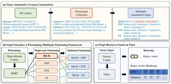 An overview of our retrieval-based QA system. (a) Step 1: automotive corpus construction. (b) Step 2: The encoder module under a pretraining–multitask fine-tuning framework. (c) Step 3: The retriever module based on Faiss library.