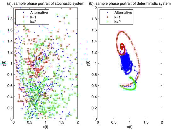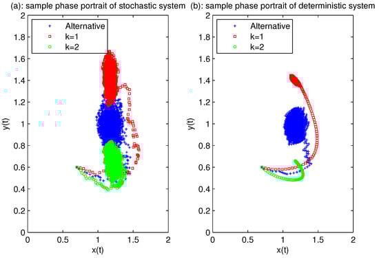 The subgraphs (a,b) represent the sample phase portraits of the stochastic system (3) and the corresponding deterministic system, respectively. Three colors represent three states— and the alternative case—between them. The white noise intensities on and are relatively small. and .