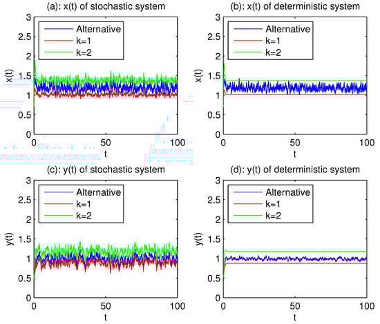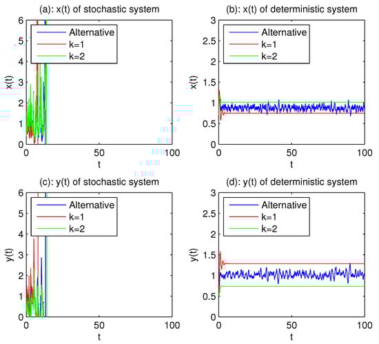 Representatively, the populations of and change over time in the states , and the alternative case, respectively. The volatility of stochastic systems solutions is not great. and .
